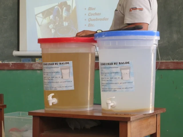 Children drink filtered water for the first time in the remote jungle village of Auca Cocha near the Amazon River in Peru.